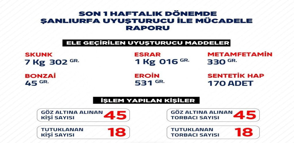 Operasyonlar ile ilgili ayrıntılarda ise 7 kilo 302 gram skunk, 1 kilo 16 gram esrar, 330 gram metamfetamin, 45 gram bonzai, 531 gram eroin maddesi ile 170 adet sentetik hapın ele geçirildiği ve yakalanan 45 ‘torbacı’ diye tabir edilen şahıslardan 18’inin tutuklandığına yer verildi.